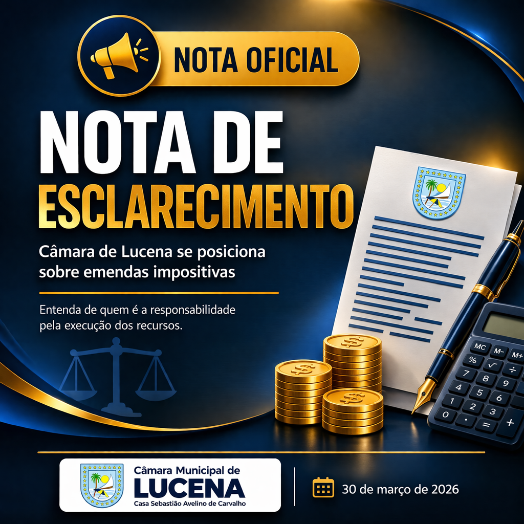 A Câmara Municipal de Lucena, no exercício de suas atribuições constitucionais e regimentais, vem a público prestar esclarecimentos acerca da nota divulgada pela Prefeitura Municipal de Lucena, por meio da Secretaria Municipal de Finanças, referente à execução das emendas impositivas.